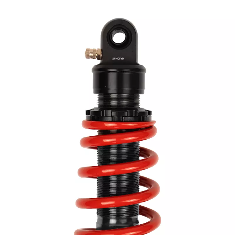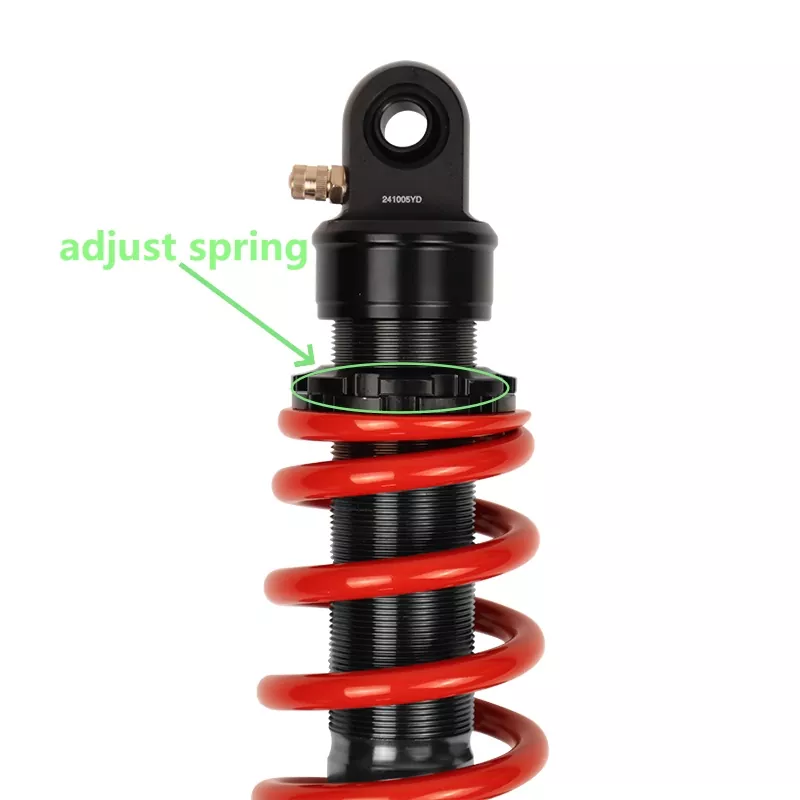 షాక్ అబ్జార్బర్ సర్దుబాటు చేయగల స్ప్రింగ్ ప్రీలోడ్ ఫీచర్లు, రైడర్లను సవరించడానికి వీలు కల్పిస్తుంది, స్ప్రింగ్ను కష్టతరం చేయడానికి సర్దుబాటు చేస్తుంది, వసంతాన్ని మృదువుగా చేయడానికి సర్దుబాటు చేస్తుంది