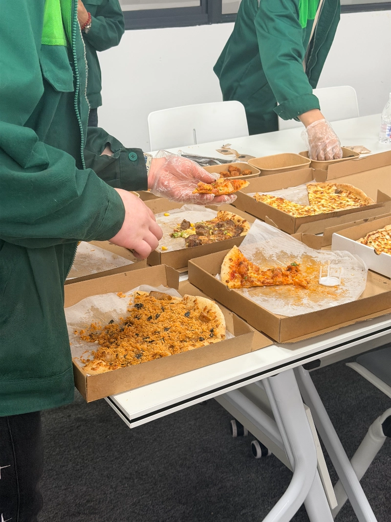 పిజ్జా ముక్క, సంరక్షణ సంజ్ఞ. ఒక సాధారణ ట్రీట్ నిశ్శబ్దంగా జట్టును దగ్గర చేసింది.